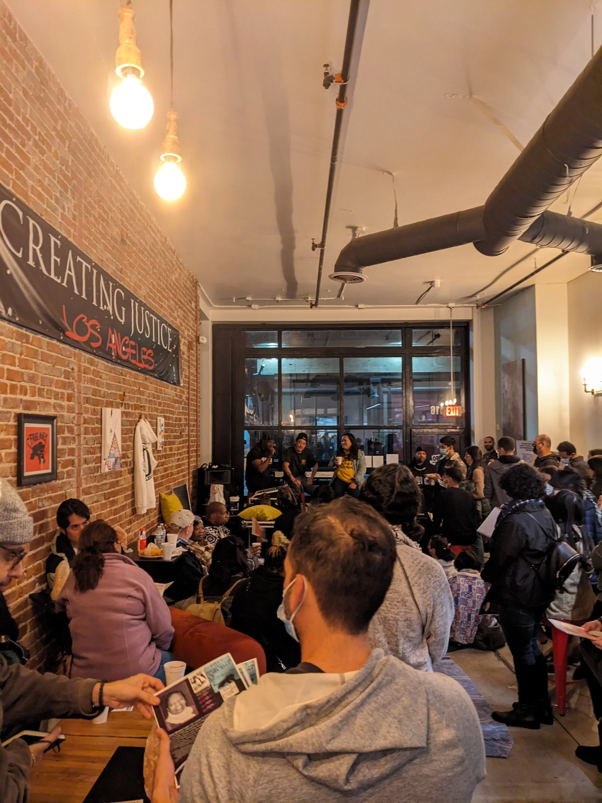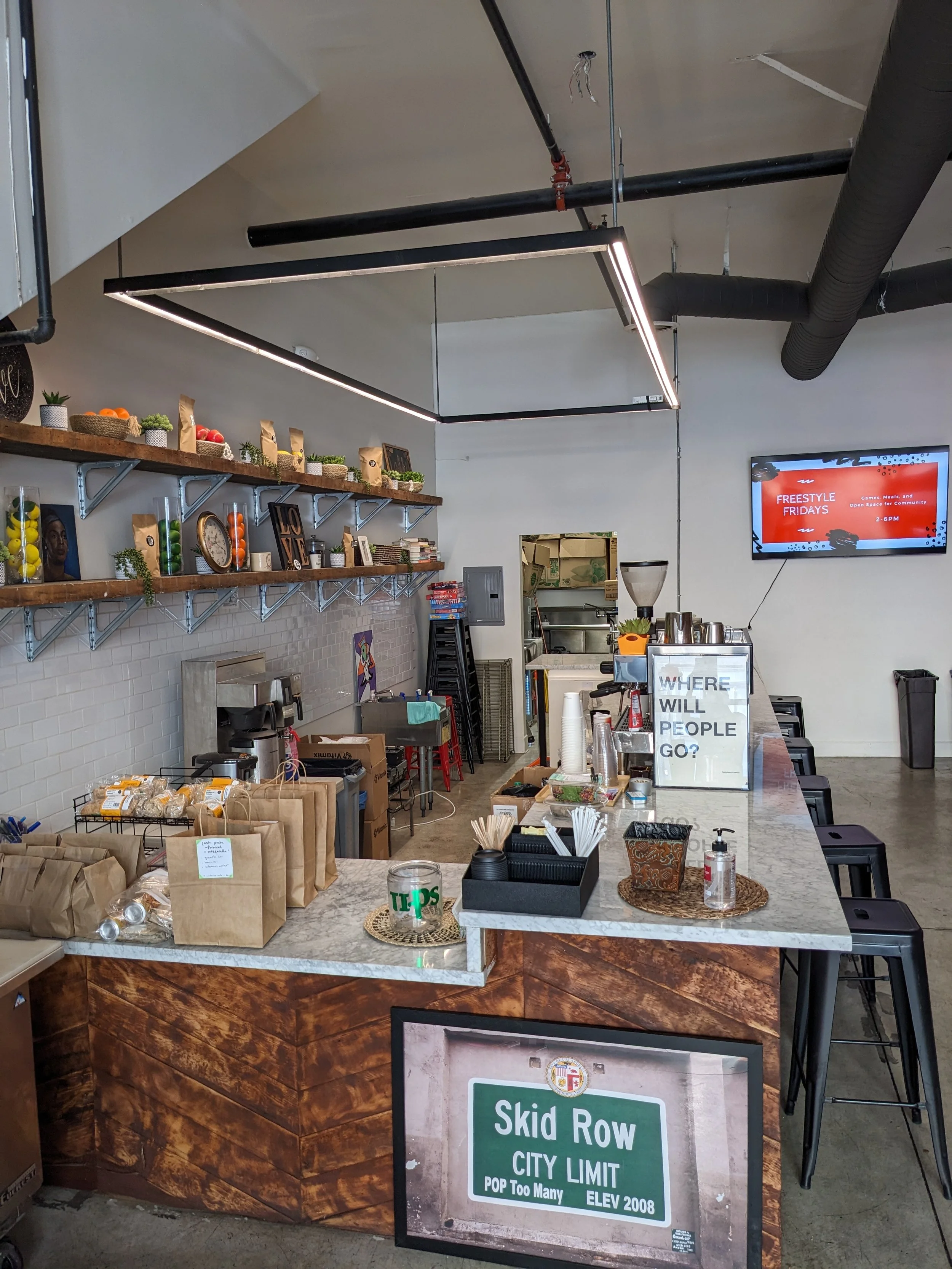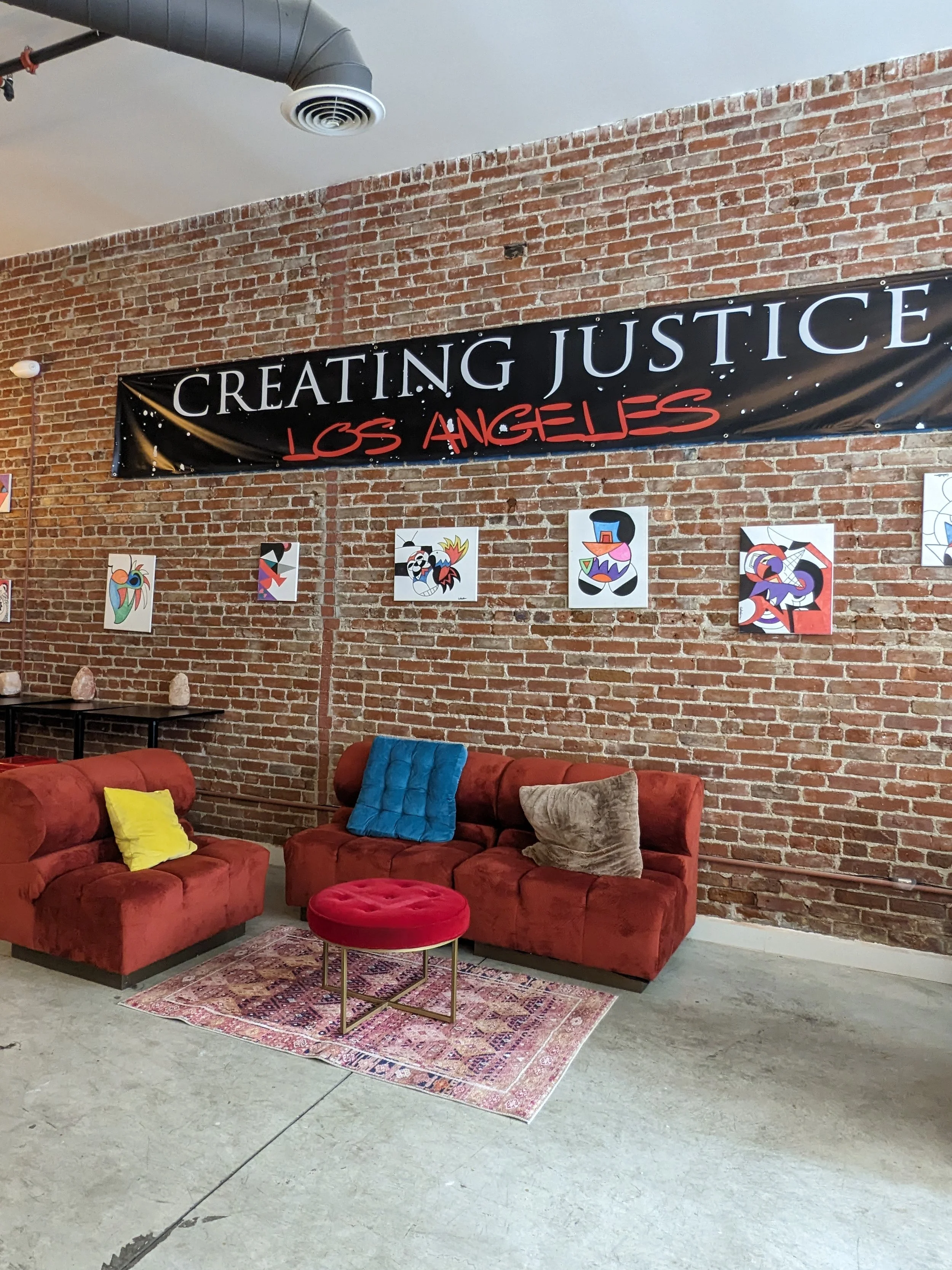 The Creating Justice LA Peace and Healing Center provides economic, social, and environmental healing in an inclusive, accessible and equitable space. In partnership with The Hip Hop Smoothie Shop, Eayikes, Skid Row People’s Market, Skid Row Coffee, The Row Church, and Polo’s Pantry, the Peace and Healing Center serves as a resource for Skid Row residents, sheltered and unsheltered, to access free programming, nutritious food & drink, and all the benefits of a “third space”. Ray Oldenburg in “The Great Good Places” argues, “For healthy existence, citizens must live in a balance of three realms: home life, the workplace, and inclusively social places.”